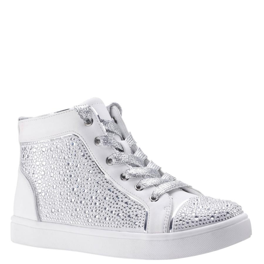 These sneakers are adorned with dazzling rhinestone embellishments and feature an inside zipper for easy on and off. This lace-up high top is where style and convenience unite to create a look that shines.