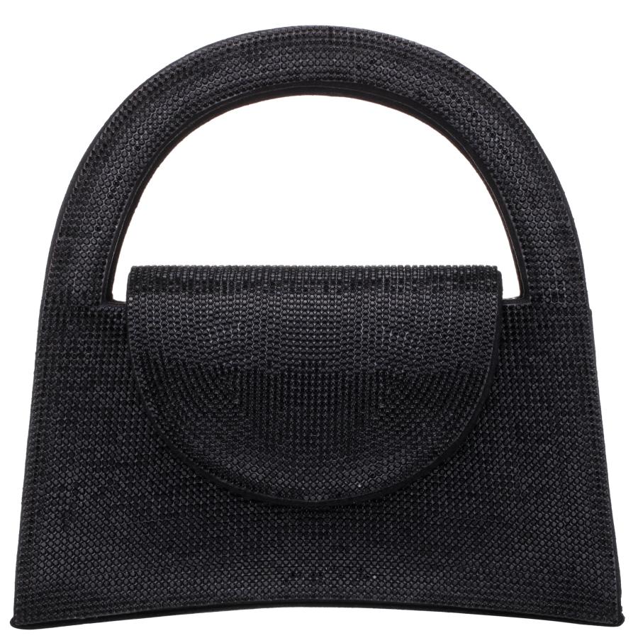 Dazzling crystals enliven this satchel evening bag crafted in a structured silhouette topped with cutout handles and outfitted with an optional chain strap.