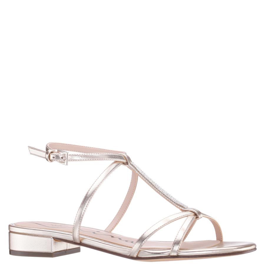 Women Nina Shoes Flats & Wedges | Sasha Platino Metallic Foil With Rhinestone T-strap Flat With A Block-heel And Ankle-strap
