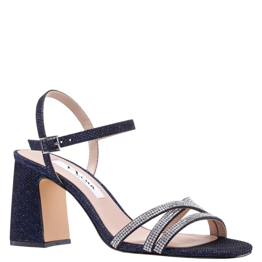 Women Nina Shoes Prom | Quella Navy Textured Metallic With Crystal Straps Block-heel Sandals With Ankle-strap